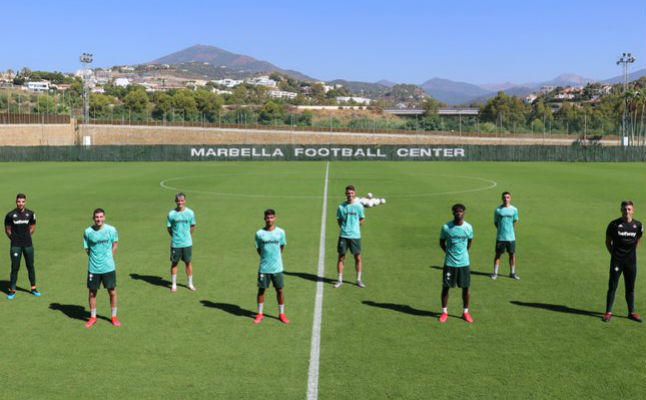 Los ocho jugadores del filial del Betis que hacen la pretemporada con Pellegrini posan en el Marbella Football Center.A. T.