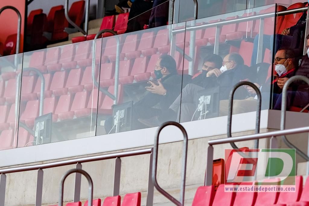 En el palco no han perdido detalle de una intensa primera mitad en la que no ha faltado de nada a pesar de que no hubo muchas ocasiones de peligro y de que se llegó con 0-0 al descanso. Una pequeña tángana en un saque de banda, un penalti sobre Calderón que le costó la roja directa al franjirrojo Pedro Ortiz, acción muy protestada por los locales y clarísima para los visitantes.