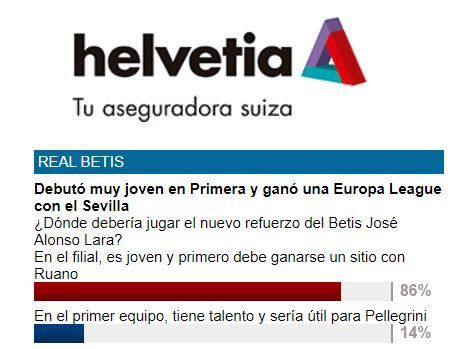 No obstante, antes de dar el salto con Pellegrini, deberá trabajar mucho, ganarse un sitio y tener continuidad y brillo en el equipo de Manel Ruano. Así se lo ha hecho saber un considerable sector del beticismo en la #EncuestaHelvetiaED propuesta por este periódico durante las últimas 24 horas. Preguntados por el papel de Lara, un mayoritario 86 por ciento aboga porque empiece en el filial y se curta, frente a un 14 por ciento que le daría ya una ficha con los 'mayores'.