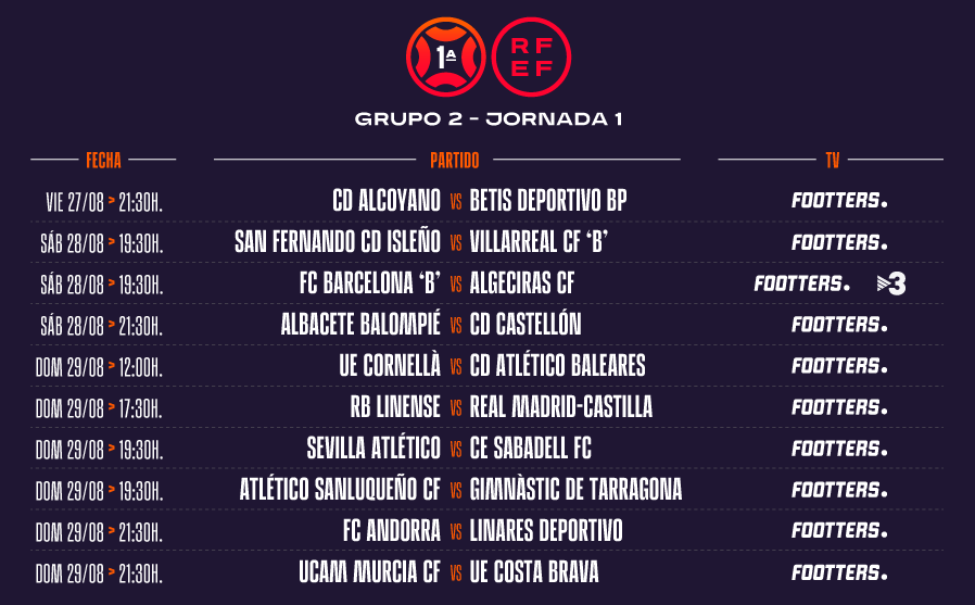 Para abrir boca, en la primera fecha, el Betis Deportivo inaugurará el grupo 2 visitando al CD Alcoyano el próximo viernes 27 a las 21:30 horas. Por su parte, el Sevilla Atlético tendrá que esperar dos días, al domingo 29 a las 19:30 horas, pues jugará en casa contra el CE Sabadell.