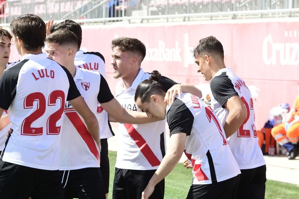 Paso firme hacia la salvación con dos goles de Iván y tantos de Luismi y Zarzana; el filial sevillista acabará la jornada fuera del descenso si el Atlético Sanluqueño no gana en su difícil visita a Albacete