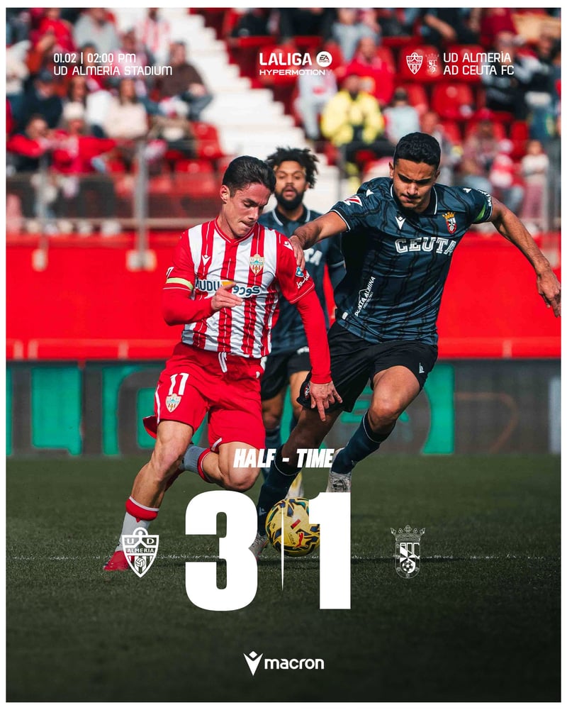 El Almería se llevó el triunfo de forma incontestable con tres goles en apenas 20 minutos durante el primer tiempo. El Almería golpeó con Sergio Arribas, Leo Baptistao y Morcillo en los minutos 17,23 y 36. El Ceuta recortó diferencias antes del descanso con el 3´1 de Zalazar e incluso se pensó en un empate de los de José Juam Romero con el 3-2 de Marcos Fernández en el 79. Embarba sentenció el partido en el 85 desde los once metros para el definitivo 4-2.