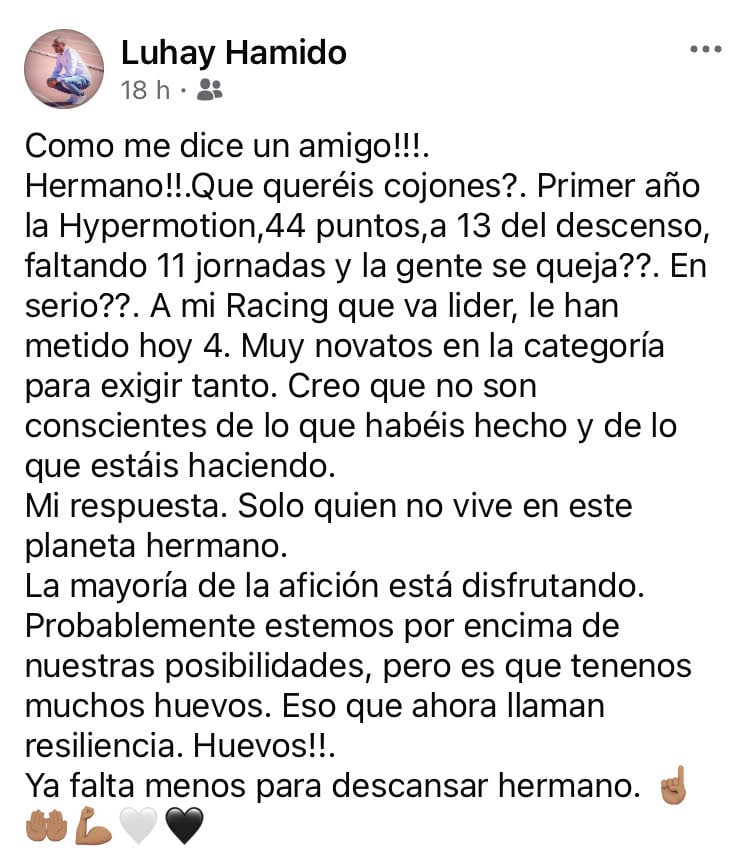Hermano!!.Qué queréis cojones?. Primer año la Hypermotion,44 puntos, a 13 del descenso, faltando 11 jornadas y la gente se queja??. En serio??. A mi Racing que va líder, le han metido hoy 4. Muy novatos en la categoría para exigir tanto. Creo que no son conscientes de lo que habéis hecho y de lo que estáis haciendo.