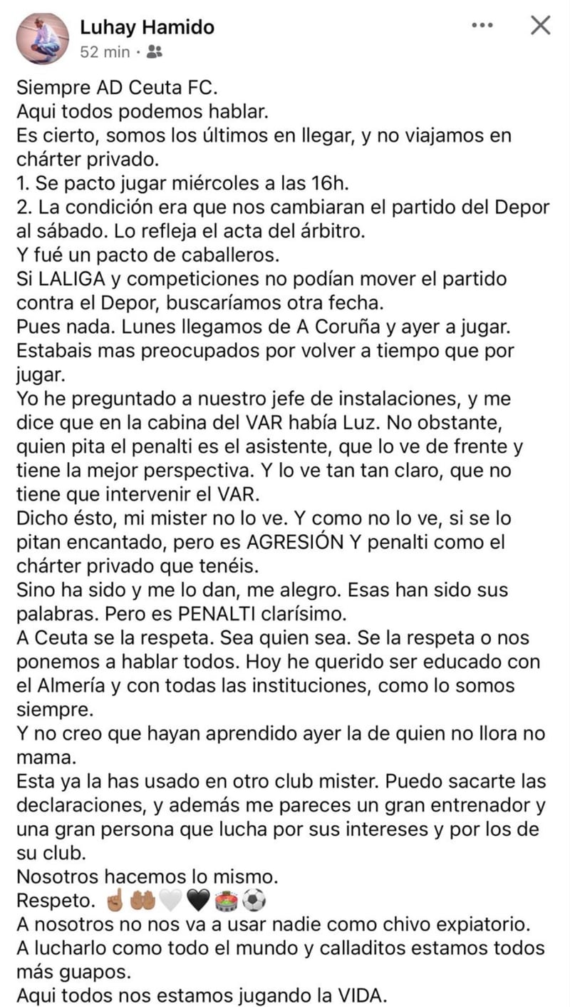 Pero Luhay Hamido no se quedó ahí y habló que tras no poder cambiarse el partido ante el Deportivo de La Coruña se buscaría otra fecha, hecho que finalmente no se dio y tras jugar el lunes, el Ceuta tuvo que enfrentarse al Almería apenas 48 horas después: "Si LaLiga y Competiciones no podían mover el partido contra el Deportivo, buscaríamos otra fecha. Pues nada. Lunes llegamos de A Coruña y ayer a jugar. Estabais más preocupados por volver a tiempo que por jugar".