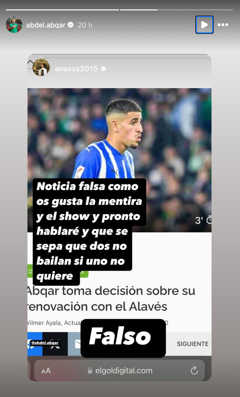 Varios medios se hacían eco de esas declaraciones, que apenas tienes mes y medio de vigencia. No ha habido cambios en la situación en todo este tiempo, pero desde el entorno del zaguero, indiscutible para Luis García Plaza, recelan de posibles filtraciones que puedan poner en su contra a a grada de Mendizorroza. Por eso, uno de sus agentes, Anass Ouzifi, contestaba a una publicación que defiende que Abqar ya ha tomado la decisión de marcharse con duras palabras y parafraseando al alto ejecutivo blanquiazul. "Noticia falsa. Cómo os gustan la mentira y el show. Pronto hablaré; y que se sepa que dos no bailan si uno no quiere", escribió el intermediario, que lleva también a los ex nervionenses Youssef En-Nesyri y Yassine Bouonou, en una 'story' de Instagram que hizo suya en su perfil el propio internacional marroquí.