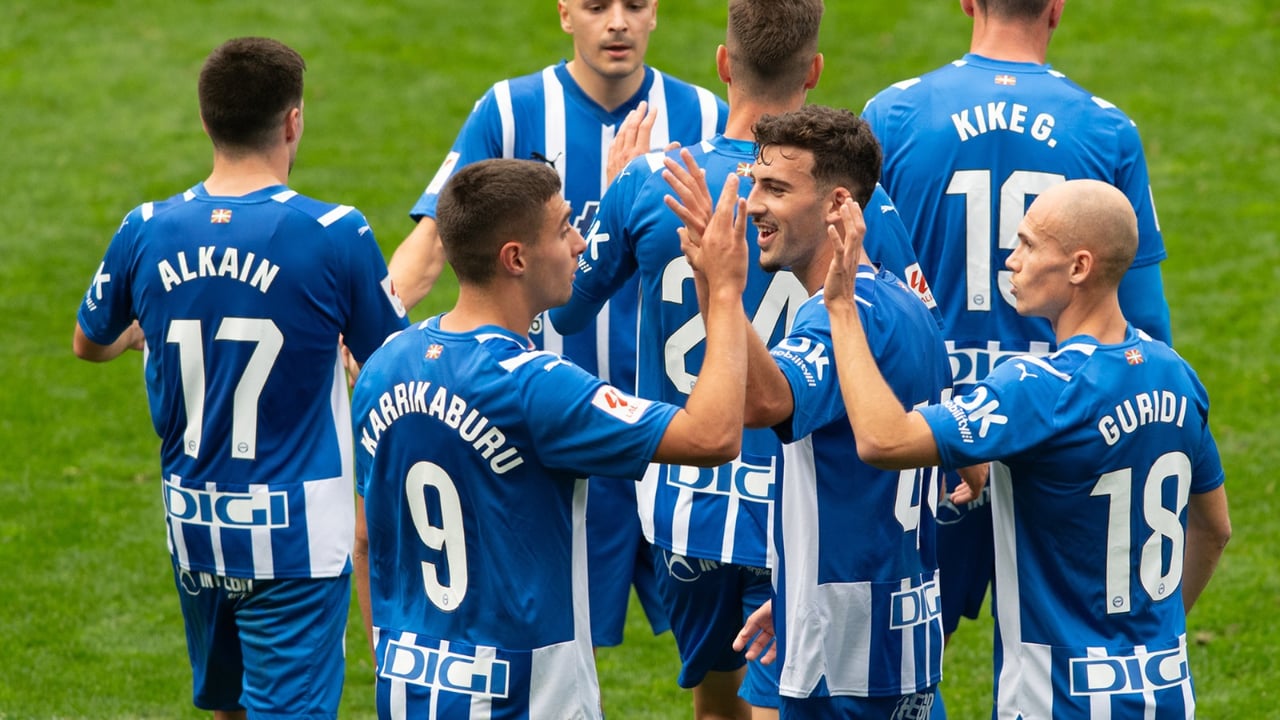 Jon Karrikaburu celebrando un gol junto a sus compañeros en el Deportivo AlavésDeportivo Alavés