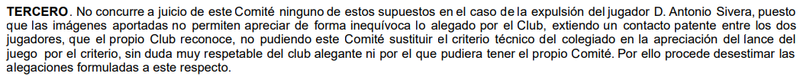 “No concurre a juicio de este Comité ninguno de estos supuestos en el caso de la expulsión del jugador D. Antonio Sivera, puesto que las imágenes aportadas no permiten apreciar de forma inequívoca lo alegado por el Club, existiendo un contacto patente entre los dos jugadores, que el propio Club reconoce, no pudiendo este Comité sustituir el criterio técnico del colegiado en la apreciación del lance del juego por el criterio, sin duda muy respetable del club alegante ni por el que pudiera tener el propio Comité. Por ello procede desestimar las alegaciones formuladas a este respecto”.