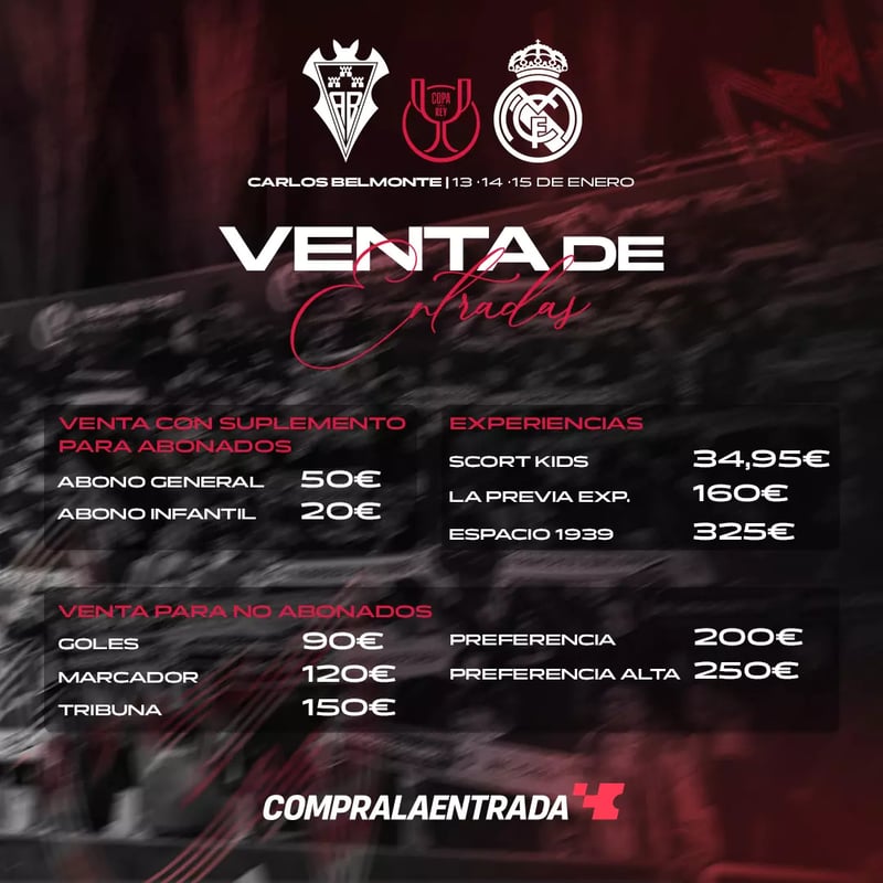 El Albacete informó de que a partir de este jueves ya se podrán adquirir las localidades para recibir al Real Madrid en los octavos de final de la Copa del Rey. En el caso de los abonados y a diferencia de lo que ha sucedido en el Racing de Santander con el partido ante el Barcelona, el Albacete ha decidido cobrar un precio de 50 euros a sus abonados en el caso del abono general y 20 euros en el abono infantil. Además, las ventas para los no abonados oscilan entre los 90 euros de los goles y los 150 euros en la tribuna. El precio de las entradas para los abonados no ha sentado nada bien en un sector de la afición del Albacete.