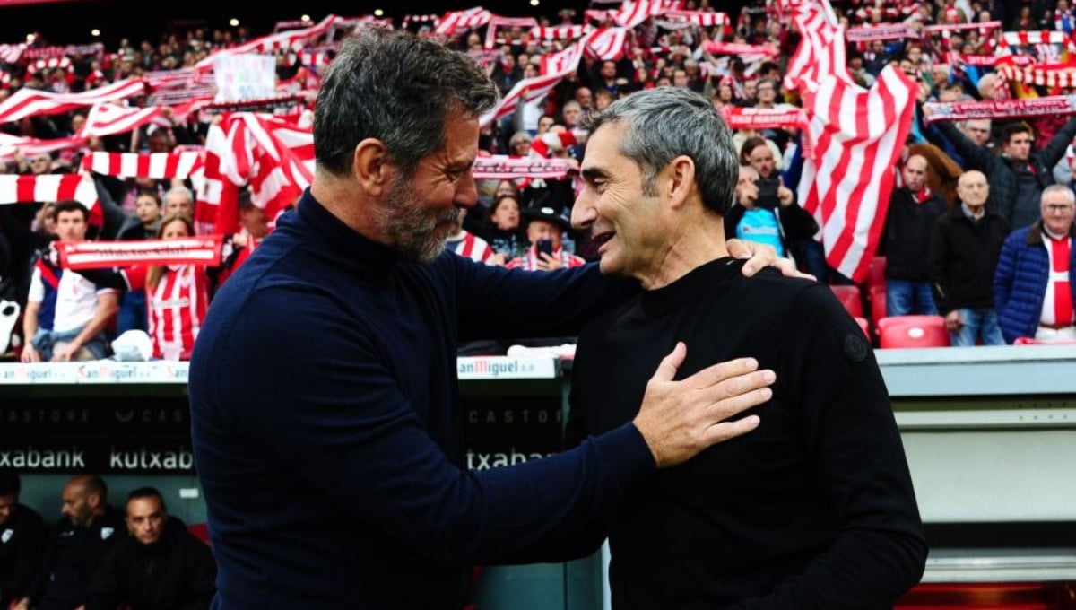 Quique Sánchez Flores y Ernesto Valverde se saludan antes del choque entre Athletic y Sevilla.LaLiga