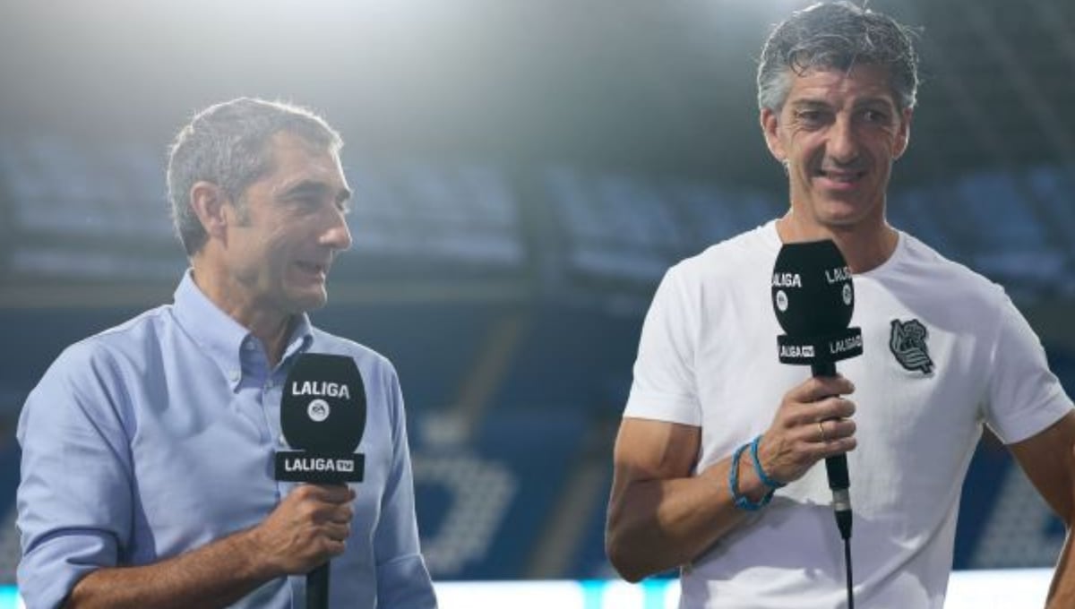 Ernesto Valverde junto a Imanol Alguacil en la previa del derbi vascoLaLiga