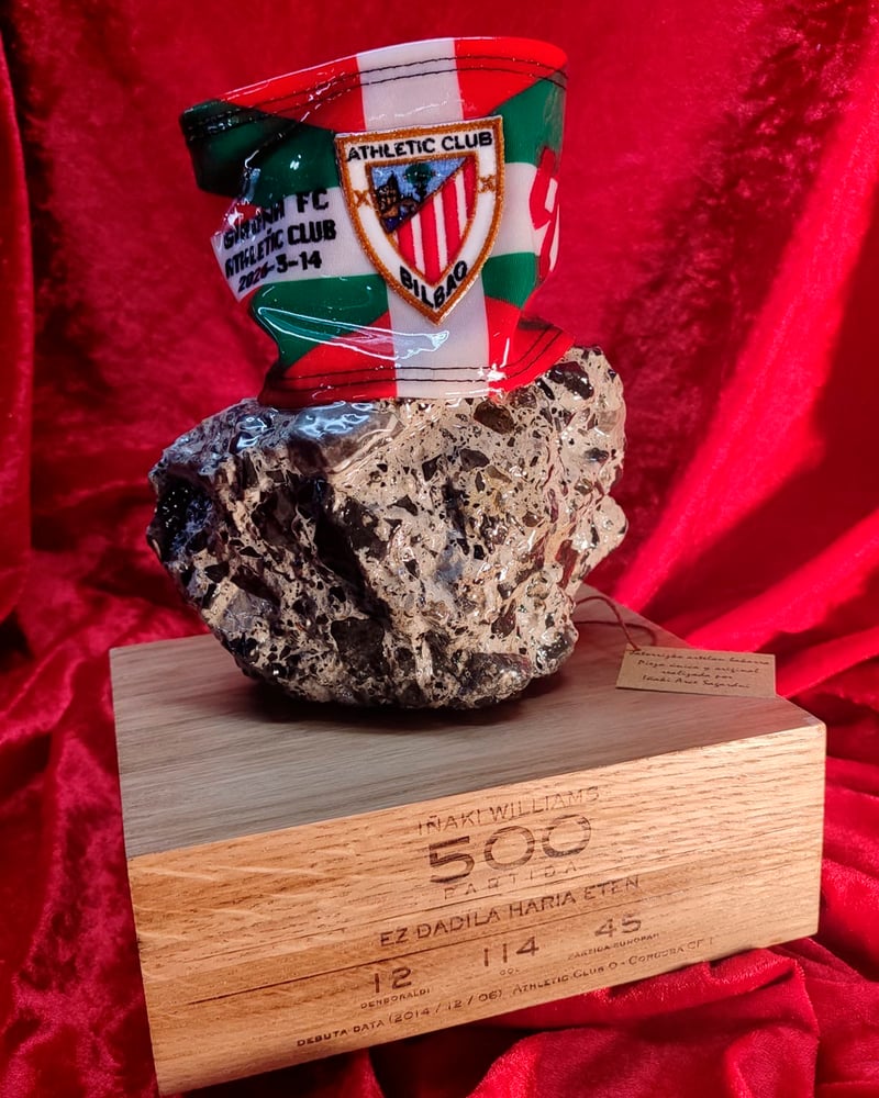 "Ez dadila haria eten", es decir, "que no se detenga la cadena", dice la leyenda grabada en la peana de madera de roble que sostiene el brazalete original que lució Iñaki Williams en Girona, tratado y solidificado con resinas para su conservación, y un trozo de piedra vestigio del antiguo y derruido estadio San Mamés, vínculo con los 128 años de historia del Athletic Club.