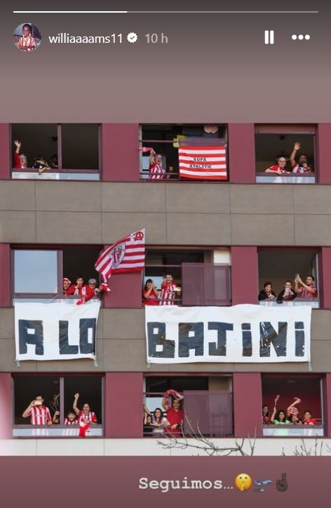 Ahora, el mayor de los hermanos Williams ha recurrido a esta frase una vez más para encender a su gente de cara al duelo con el Atlético. Es más, ni siquiera ha hecho falta ponerlo. Le ha bastado con una 'storie' de Instagram en la que se lee un "Seguimos" junto a varios emoticonos de silencio y una fotografía de la fachada de un edificio bilbaíno tuneada con los colores del Athletic y con una enorme pancarta en la que se lee 'A lo bajini'. Pues eso, no sólo insiste sino que refuerza la asociación mental del prudente lema con un desenlace festivo y de celebración.