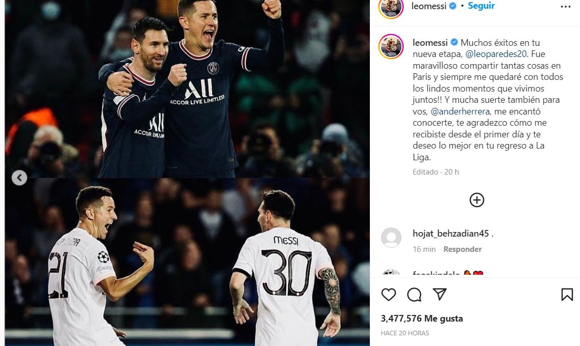 "Mucha suerte para vos, Ander Herrera. Me encantó conocerte, te agradezco cómo me recibiste desde el primer día y te deseo lo mejor en tu regreso a LaLiga", escribió Leo Messi en sus redes sociales a Ander Herrera que demuestra la calidad humana del nuevo jugador del Athletic Club así como su liderazgo dentro del vestuario y la huella que ha dejado en el astro argentino, quien, sin duda, lo echará de menos en el PSG.
