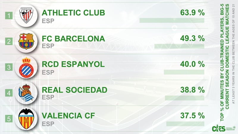Sin embargo lo realmente curioso es la estadística que el propio club vasco a publicado en su web oficial con respecto al Atlas Demográfico elaborado por el prestigioso centro de investigación suizo CIES Football Observatory que revela que el Athletic es el equipo de Europa que más emplea a sus canteranos de las cinco grandes ligas, con un 63.9% de los minutos disputados por jugadores formados en Lezama. Casi 15 puntos por debajo le sigue el FC Barcelona, con el 49.3% de los minutos. En LaLiga, tras el Athletic (63.9%), completan el top 5 el FC Barcelona (49.3%), el RCD Espanyol (40%), la Real Sociedad (38.8%) y el Valencia CF (37.5 %).