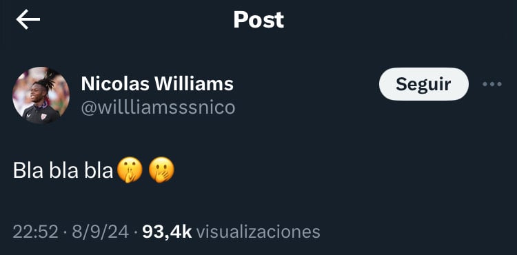 Es lo que tiene convertirse en un futbolista mediático: todo lo que dices, haces o piensas se convierte rápidamente en objeto de debate e incluso de confrontación. Le ha vuelto a suceder a Nico Williams, quien ha desatado un mar de especulaciones con un mensaje tan escueto como misterioso que escondía un zasca que las redes sociales aún no han conseguido descifrar, aunque no faltan teorías de todo tipo sobre su posible destinatario. Para mayor morbo y curiosidad, el futbolista del Athletic Club debió arrepentirse y optó por eliminar su post apenas unos minutos después de compartirlo. Para entonces, ya había sido compartido por varios cientos de usuarios, acumulaba miles de 'Me gusta' y había generado numerosos comentarios de todo tipo. Desde la crítica, al elogio pasando incluso por alguna que otra falta de respeto. Y todo ello, con una simple onomatopeya repetida tres veces y dos emoticonos. Las cosas de las redes.