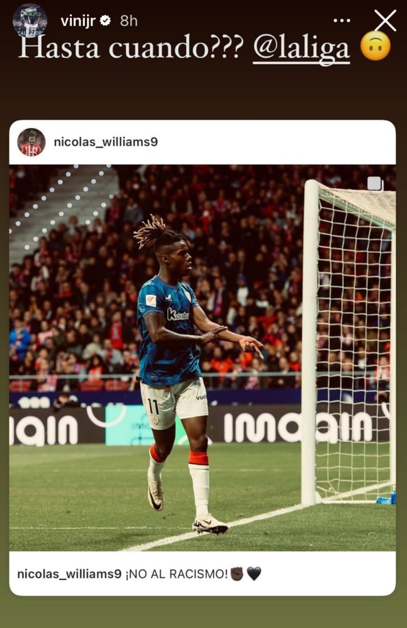 Vinicius, quien también ha sufrido en numerosas ocasiones gestos y sonidos racistas, envió a través de sus redes sociales un mensaje de apoyo al jugador del Athletic y se mostró contundente con respecto a esta lacra