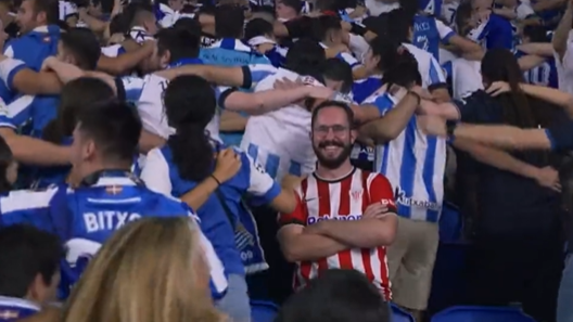 Mientras los seguidores de la Real Sociedad disfrutaban con un baile grupal abrazados y con variedad de movimientos en uno de los fondos, un aficionado del Athletic Club de Bilbao permanecía impertérrito entre la muchedumbre realista. Con una sonrisa de orgullo y cierta resignación aguantó el chaparrón durante la 'locura' realista.