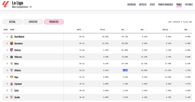 En esta ocasión, el conjunto bilbaíno acabaría séptimo, lo que a día de hoy solo le daría para estrenarse en la Conference League. En concreto, se estima que acabaría con 52,56 puntos, acechado por el Rayo Vallecano (que finalizaría octavo con 51,41) y a una importante distancia de un Real Betis que mantendría su actual quinta plaza y, por tanto, regresaría a la Europa League con 60,12 puntos. Mucho más lejos aún, por su parte, estaría la cuarta posición que asegura disputar la máxima competición continental, la cual lograría un Villarreal con 70,12 puntos.