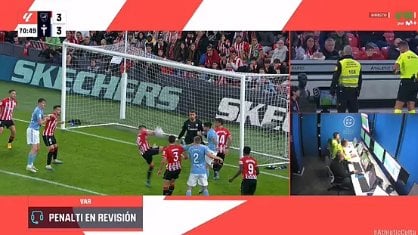 Ninguna de las dos acciones previas a los goles parecieron merecedoras de falta y, por tanto, ambos tantos subieron al marcador. Pero los colegiados tuvieron mucho más trabajo tras el descanso, al que se llegó con 2-2 en el electrónico. Para empezar, hubo otro gol anulado al Celta en el 64, pero Larsen ni siquiera lo celebraba, consciente de que estaba en fuera de juego, y en el 71’, Pulido Santana acudía al monitor del VAR a revisar una mano de Guruzeta en el área, pitando un penalti a la postre fallado por Aspas.