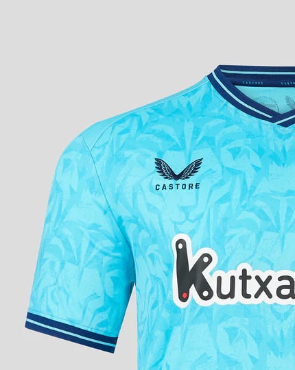 La nueva indumentaria no solo es estéticamente atractiva, sino que también rinde homenaje a la rica historia del club. El gráfico dinámico que adorna la equipación es un tributo a los leones de San Mamés. Este detalle tiene un significado profundo, ya que rememora la leyenda del mártir Mamés, quien, según cuenta la historia. El cuello en pico y los puños en las mangas presentan un contraste de colores que resalta la elegancia del diseño. Los pantalones azules y las medias a juego, rematadas con un toque negro en la parte superior, completan el conjunto con estilo y armonía.Para los porteros, también se ha diseñado una equipación especial que mantiene el estilo de la primera equipación, pero incorpora un atractivo tono lila. Esta variante destaca por su elegancia y originalidad, proporcionando a los guardametas del Athletic una apariencia distintiva en el terreno de juego.