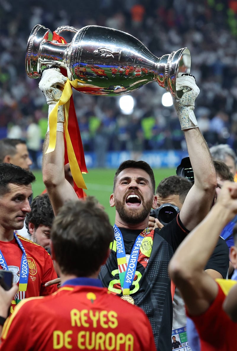 El portero del Athletic Club y de la selección española, que será operado este jueves de su lesión, ha completado con la Eurocopa 2024 una temporada inolvidable en la que ha conseguido igualar, casi de una tacada, el palmarés de su gran ídolo, su amigo y su maestro José Ángel Iribar. Palabras mayores