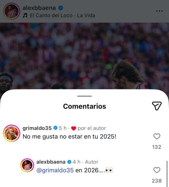 En medio de todo ello, los aficionados colchoneros se han ilusionado tras el guiño de Alejandro Grimaldo a Álex Baena en redes sociales. El actual centrocampista del Atlético de Madrid publicó un repaso de su año en imágenes, como su llegada al Metropolitano, el adiós del Villarreal, la recuperación de la apendicitis que sufrió o los goles anotados con la selección española. Un balance ante el que su compañero en la 'Roja' respondió: "No me gusta no estar en tu 2025!". Pero lo que desató todo tipo de comentarios entre los seguidores rojiblancos fue a su vez el mensaje del propio Baena: "En 2026...".