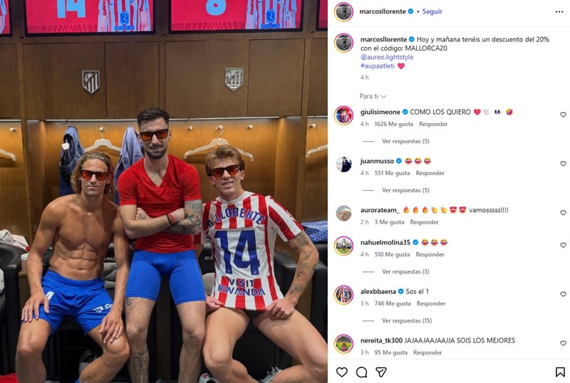 Poco más tarde, el propio Llorente también publicaba una foto en su perfil de Instagram en el vestuario del Atleti, donde se le podía ver a él, a Álex Baena y a Pablo Barrios con esas gafas. "Hoy y mañana tenéis un descuento del 20% con el código: MALLORCA20".