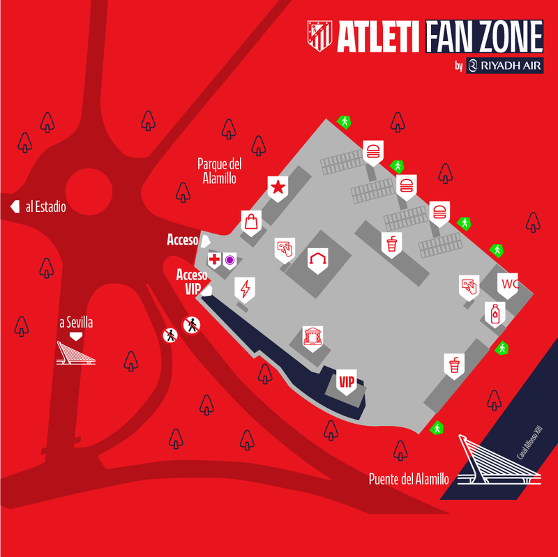 Aunque la organización no ha confirmado de forma oficial la instalación de pantallas gigantes para seguir el partido desde la fan zone, sí se ha diseñado el espacio como un punto neurálgico para la afición rojiblanca durante las horas previas al encuentro. En cualquier caso, el Atlético de Madrid también ha anunciado la apertura de su estadio, el Metropolitano, para que aquellos aficionados que no se desplacen a Sevilla puedan seguir la final desde Madrid, previa adquisición de entrada.