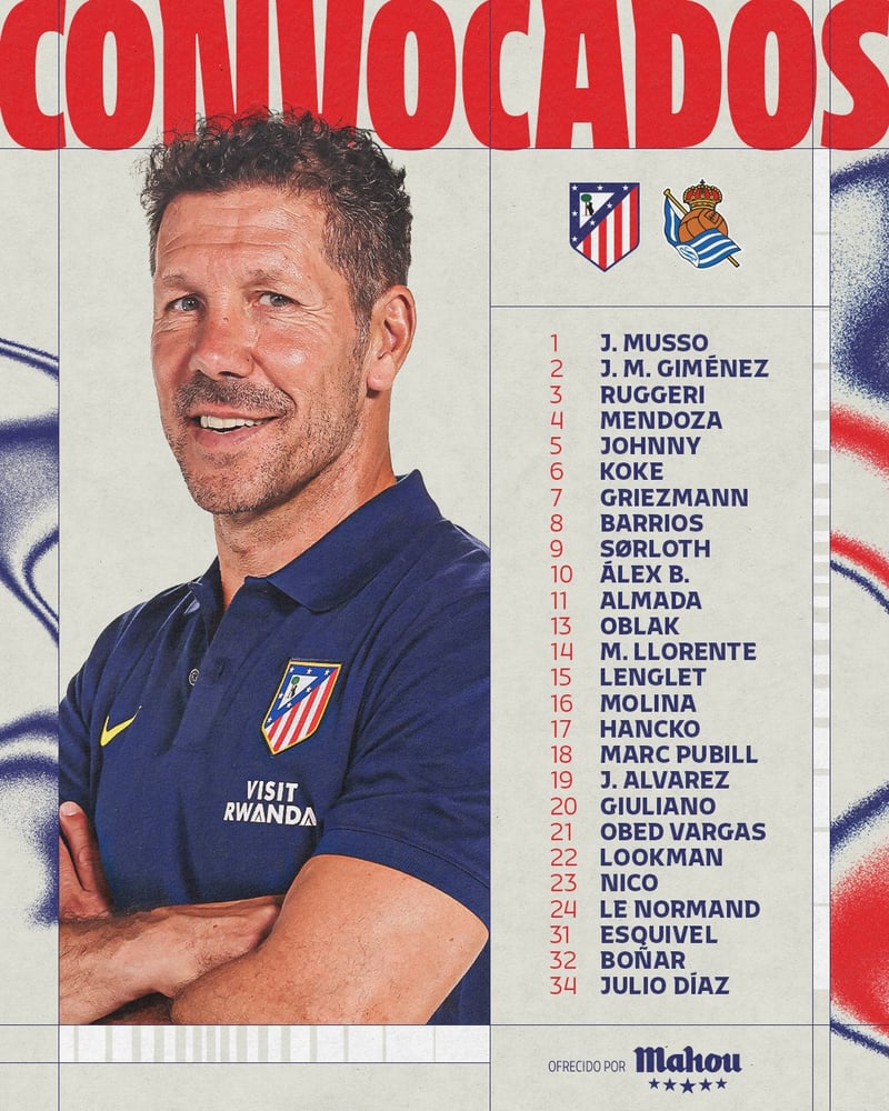 En esta lista de convocados también entró Pablo Barrios, que tal y como apuntamos anteriormente, se ejercitó junto al resto de sus compañeros este jueves y es un futbolista importante para Simeone. La lista de convocados la conforman los siguientes 23 futbolistas: Musso, Giménez, Ruggeri, Mendoza, Johnny Cardoso, Koke, Griezmann, Barrios, Sorloth, Álex Baena, Almada, Oblak, Marcos Llorente, Lenglet, Nahuel Molina, Hancko, Marc Pubill, Julián Álvarez, Giuliano, Obed Vargas, Lookman y Nico.
