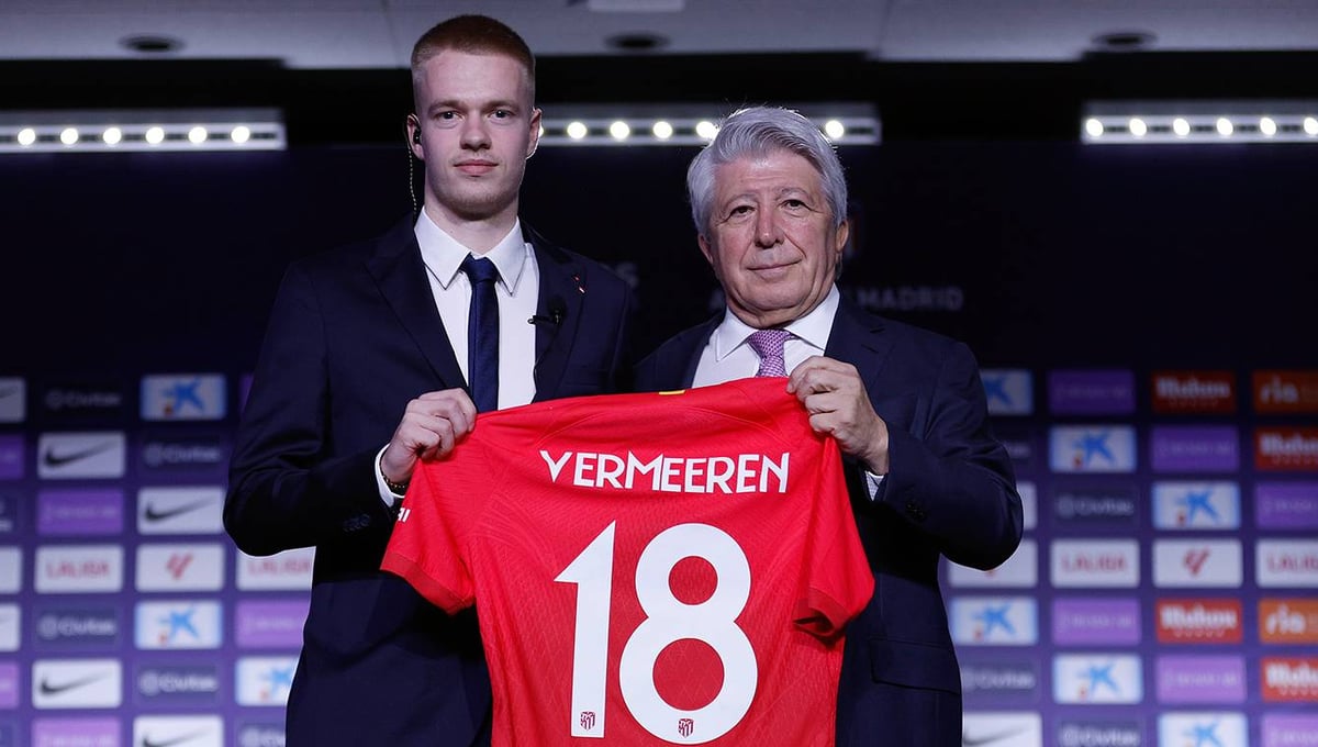 Este 29 de enero del 2024 ha tenido lugar la presentación del último de los fichajes del Atlético de Madrid, quien llega durante el mercado de invierno: Arthur Vermeeren. Se ha hado en un acto ante los medios de comunicación celebrado en el Cívitas Metropolitano, donde el futbolista belga de 18 años se ha dado a conocer. Se trata, segú el presidente del club colchonero Enrique Cerezo de "uno de los medios centros de más talento y mayor proyección mundial". El mandatario no ha escatimado en elogios hacia el nuevo pupilo de Diego Pablo Simeone en su discurso: "Es un futbolista con un enorme futuro, que ilusiona a nuestra afición y que era pretendido por numerosos clubes por su indudable calidad y talento. Con su llegada, continuamos con nuestra apuesta por incorporar jugadores jóvenes y de calidad que nos permitan consolidar en el fútbol el gran nivel que nuestro equipo viene demostrando los últimos años", indicó.