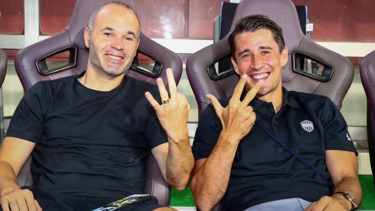 Bojan, junto a Andrés Iniesta en el banquillo del Vissel Kobe.Twitter / Bojan Krkic