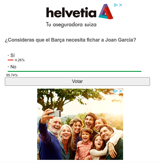 Según los datos de la Encuesta Helvetia de hoy en ESTADIO Deportivo, donde se pregunta a la afición sobre su de verdad el Barça necesita un fichaje como el de Joan García, la respuesta ha sido muy clara. Más del 95% de los votos emitidos consideran que el guardameta del Espanyol no es una prioridad para el conjunto blaugrana.