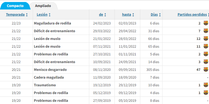 La temporada pasada sólo jugó 14 partidos de titular de los 51 en los que participó en total. Logró una buena cifra goleadora (10) repartidos entre Liga (7), Copa del Rey (2) y Supercopa de España (1). Ansu quiere dejar atrás las malditas lesiones y volver a ser uno de los faros ofensivos del conjunto catalán. Con tan sólo 20 años este es su historial de lesiones: