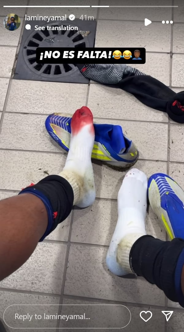 Lamine Yamal, una vez había finalizado el choque, compartió en sus historias de Instagram una fotografía de cómo le ha quedado el pie izquierdo tras dicha acción. Toda la puntera del calcetín de su pie izquierdo está completamente empapado en sangre como consecuencia del pisotón del jugador grancanario. La imagen que ha subido el futbolista iba acompañada de un mensaje en tono humorístico y que conlleva un mensaje de crítica al arbitraje llevado a cabo por Cordero Vega. “¡No es falta!”, se podía leer en la imagen, acompañado de dos emoticonos de risa y otro de un hombre con la mano en la cara.