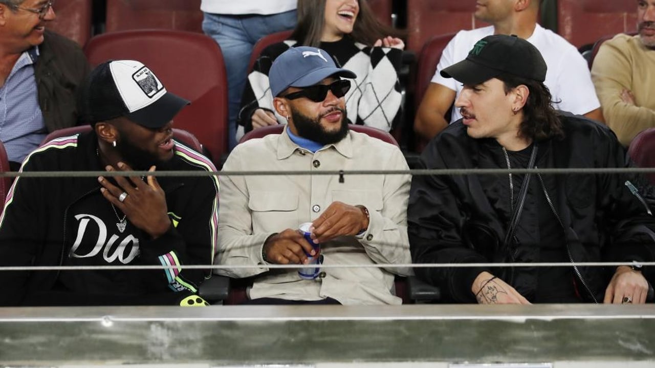 Héctor Bellerín, en la grada del Camp Nou junto a sus compañeros de equipo Kessié y Depay. UES