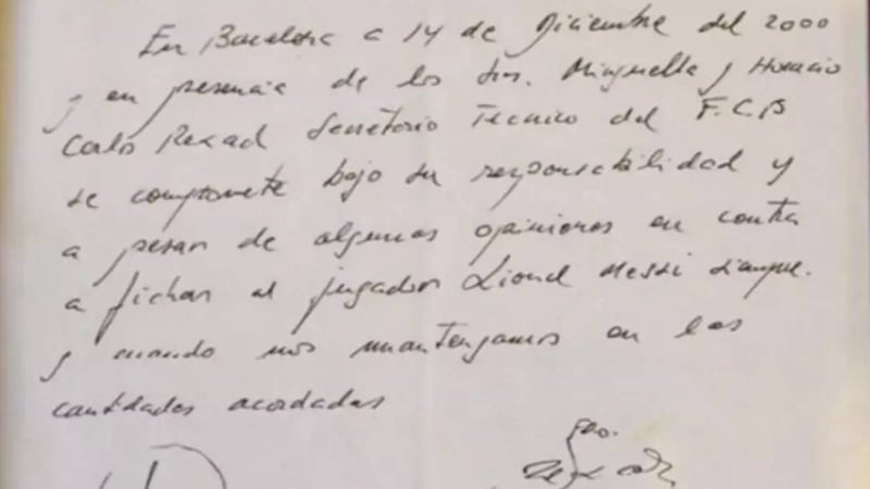 La servilleta en la que estampó su rúbrica pertenecía a La Reial Societat de Tennis Pompeia, de Montjuïc. Y en ella se lee perfectamente la letra de Carles Rexach, quien redactó lo siguiente: “En Barcelona, a 14 de diciembre del 2000 y en presencia de los Sres. Minguella y Horacio, Carles Rexach, secretario técnico del FC Barcelona, se compromete bajo su responsabilidad y a pesar de algunas opiniones en contra a fichar al jugador Lionel Messi siempre y cuando nos mantengamos en las cantidades acordadas”.