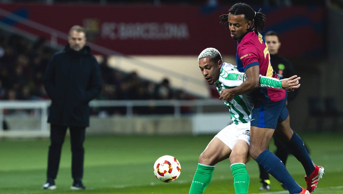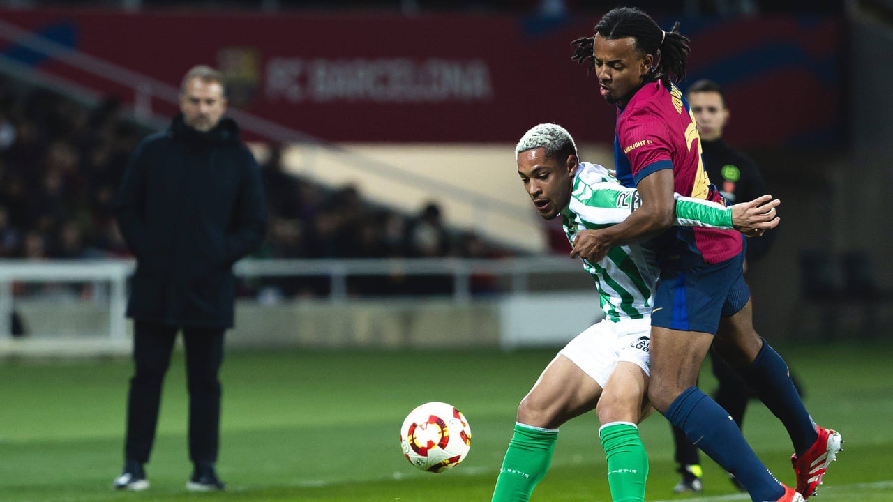 Koundé marca a Vitor Roque en presencia de Flick en el regreso del ariete brasileño al Camp Nou el pasado miércoles.CORDON PRESS
