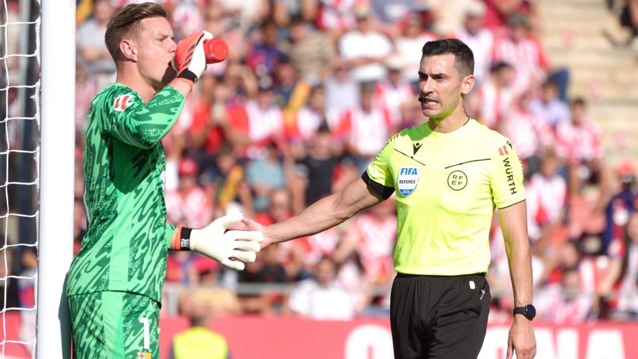 La primera parte del partido daba sus últimos coletazos cuando una acción desató la polémica en Montilivi. El Barcelona ganaba 0-2 con un doblete de Lamine Yamal y el partido parecía encarrilado para los blaugranas. Fue entonces cuando un centro desde la banda izquierda u unos rebotes en el área acabaron con Múñiz Ruíz señalando los once metros. El balón había impactado en el brazo extendido de Íñigo Martínez y el colegiado no dudó en pitar penalti. Abel Ruíz ya se disponía a colocar el balón en el punto central del área cuando desde la sala VAR avisaron al árbitro del encuentro para que revisase la jugada.
