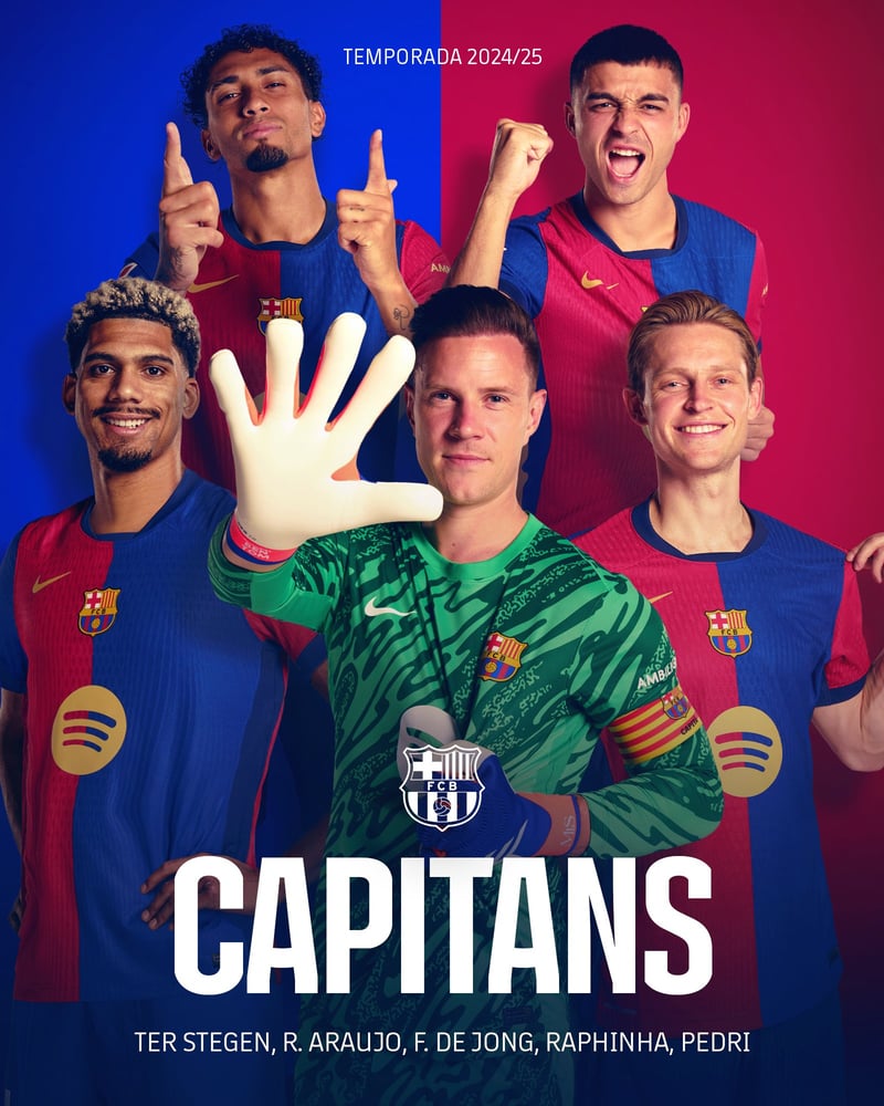 El FC Barcelona también anunció este viernes los nombres de los cinco jugadores que liderarán el vestuario de Flick. Marc-André Ter Stegen, Ronald Araujo, Frenkie de Jong, Raphinha Dias y Pedri González, en este orden, serán los encargados de llevar el brazalete de capitán esta temporada. Así, tras una democrática votación en el vestuario, el meta alemán ha sido designado por sus compañeros como el encargado de suceder a Sergi Roberto, que abandonó el equipo de toda su vida este verano después de terminar contrato.