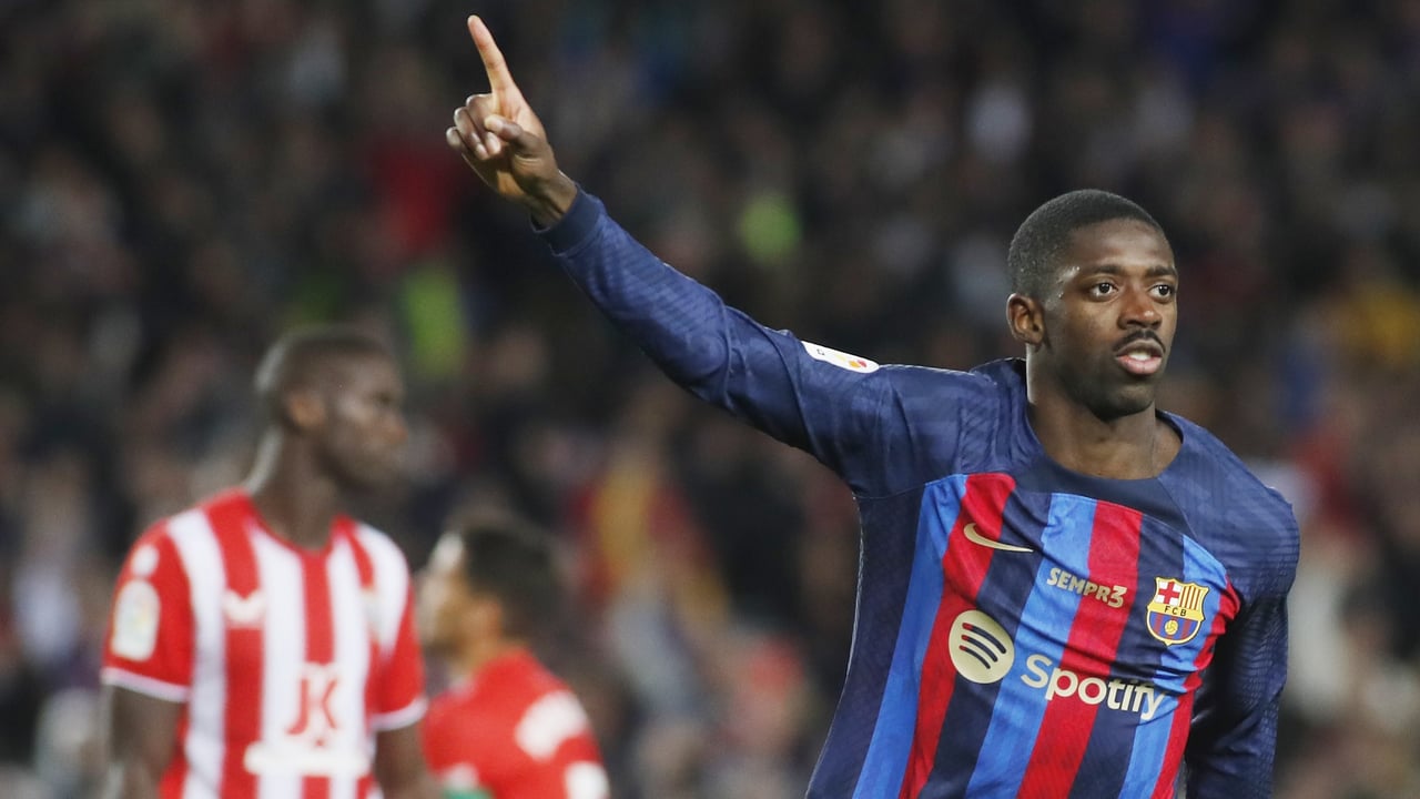 Ousmane Dembélé celebra un gol ante el AlmeríaUES