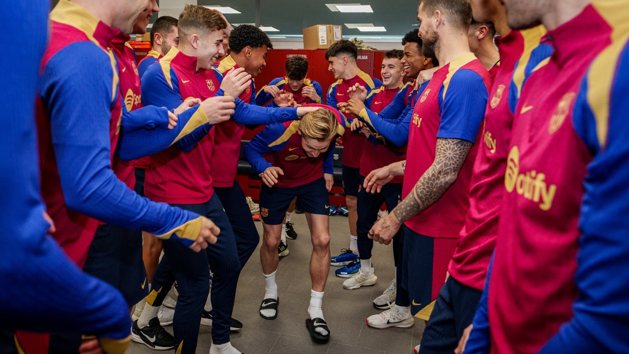 Frenkie de Jong, felicitado por sus compañeros tras cumplir 200 partidos oficiales con el FC Barcelona.@FCBarcelona_es