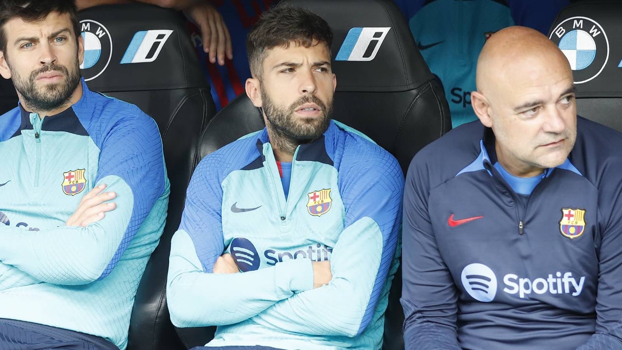 Jordi Alba, viendo el partido en el banquillo del FC Barcelona junto al ya retirado Gerard Piqué.UES