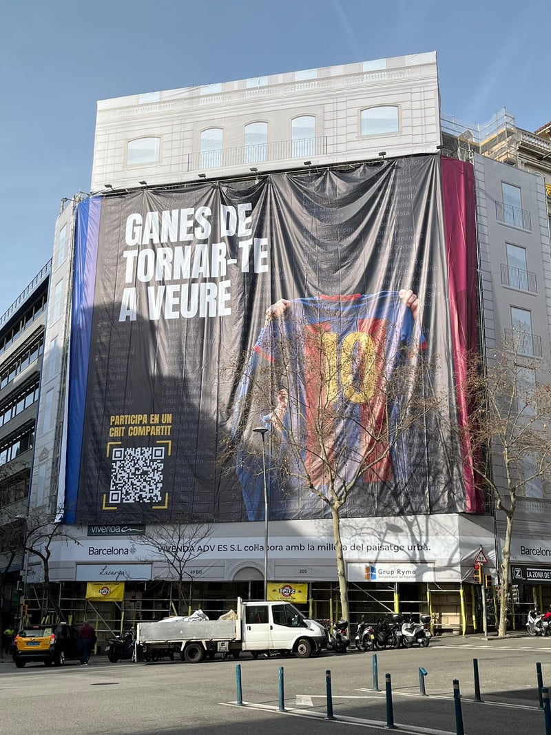 La lona es de 24x18 metros y ha sido abonado por un grupo de socios, cuyos nombres figuran en el fondo de la pancarta. Además, en la parte inferior figura un código QR con la idea de interactuar con Messi y poder enviar mensajes de vídeo al argentino. La idea es que Leo Messi reciba de primera mano el cariño de los aficionados del Barcelona, recordándole los grandes momentos que dio a la entidad azulgrana y con el deseo de que algún día pueda regresar al club que se lo dio todo.