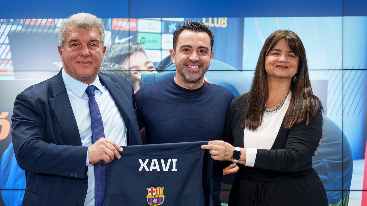 Xavi posa junto a Joan Laporta y Marta Segú como nuevo embajador de la Fundació FC Barcelona.FC Barcelona