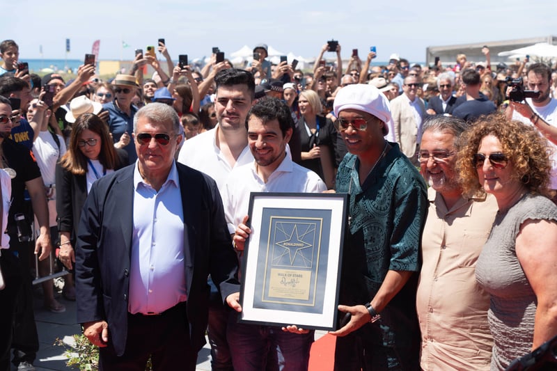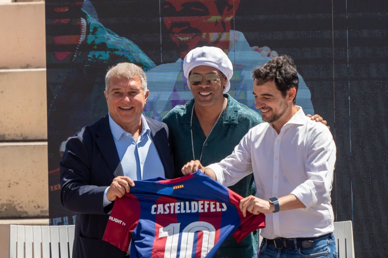 El presidente del FC Barcelona, Joan Laporta, y el exjugador azulgrana Ronaldinho fueron homenajeados este sábado con las dos primeras estrellas en la inauguración del paseo de la fama de Castelldefels, ubicado en el Paseo Marítimo de la ciudad catalana.