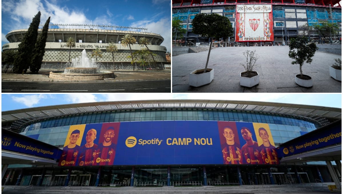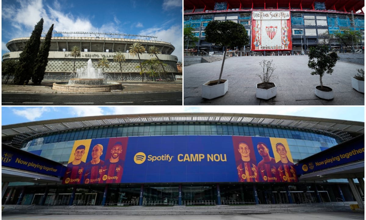 Spotify ya luce en la fachada del Camp Nou. El Barça ingresará 70 millones y Florentino no descarta 'apellidar' al nuevo Bernabéu. ¿Es posible ver algo así en el Sánchez-Pizjuán o el Benito Villamarín? Responden los clubes