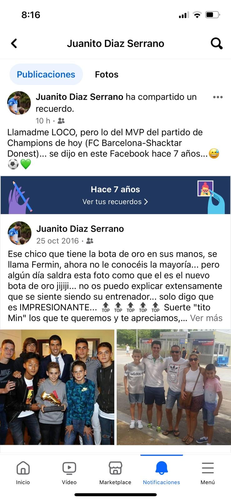 Pues ESTADIO Deportivo ha indagado hoy un poco más en la historia del barcelonista Fermín, tras su gol conseguido en la Champions League ante el Shakhtar. Y es que ayer salió a la luz una de las muchas premoniciones que se hicieron en su día sobre el brillante futuro que tendría el onubense en el mundo balompédico. Pero esta impacta más que el resto por las palabras que su protagonista, Juan Díaz Serrano, redactó aquel día en su cuenta personal de Facebook.