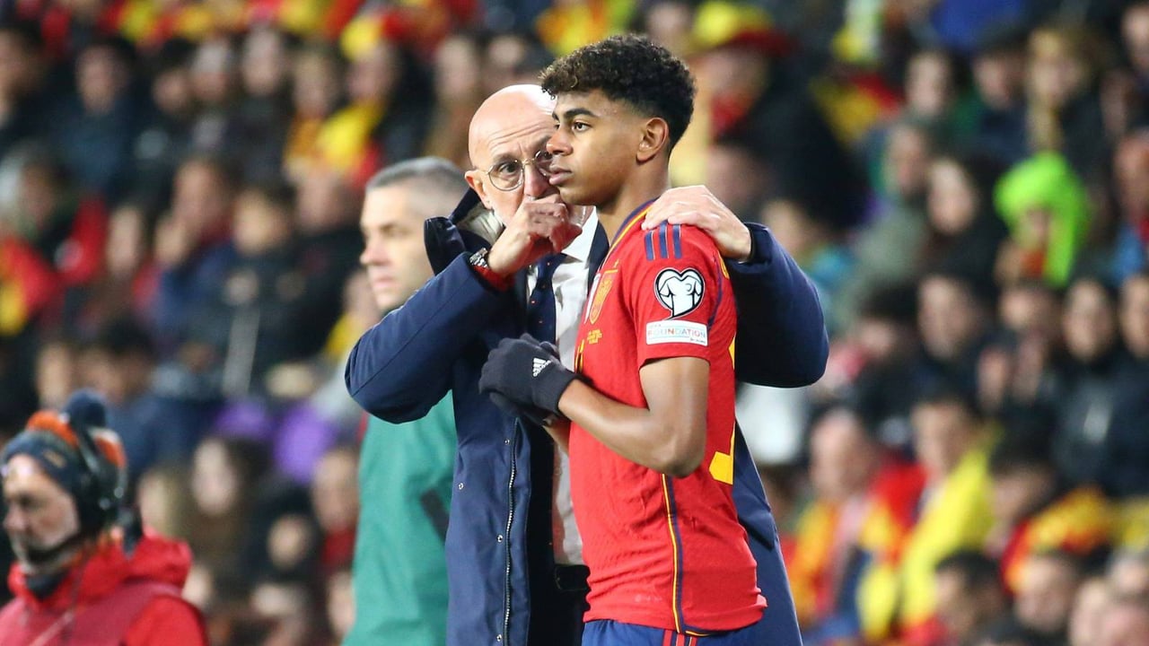 Luis de la Fuente le da instrucciones al barcelonista Lamine Yamal con España.Cordon Press
