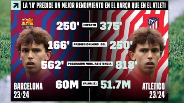Según la IA, el rendimiento de Joao Félix en el Barça se vería mejorado. Su valor de mercado subiría hasta los 60 millones de euros, por 51,7 'kilos' que tendría en el Atleti. En la escuadra catalana daría una asistencia cada 562 minutos, mientras que en su actual club el promedio sería cada 818 minutos. En cuanto a goles, en el FC Barcelona dejaría un tanto cada 166' y en el conjunto colchonero cada 250'.