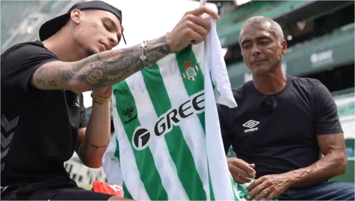 El propio Antony ya compartió hace un par de días una imagen con Romario en la que ambos posaban sobre el verde del coliseo de La Palmera con camisetas del Betis serigrafiadas con sus respectivos nombres. Este miércoles, el club heliopolitano ha difundido por redes sociales varios vídeos de ese glamuroso encuentro, con piropos cruzados y con ambos compartiendo los secretos de sus trucos más populares. Así, el ariete le enseñó a hacer su recordada 'cola de vaca' con la que dejó clavado a Rafael Alkorta en un Clásico entre FC Barcelona y Real Madrid que terminó con manita culé (5-0). A cambio, el extremo mostró cómo hace su conocida 'peonza', girando con rapidez sobre su propio eje sin que la pelota se despegue del interior de su bota.